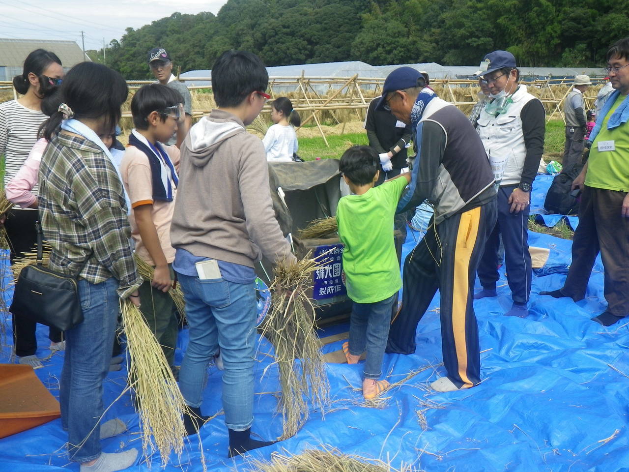 稲穂から籾(もみ)、籾から籾がらをはずし、玄米までにするのが脱穀です。千歯こき、足踏み脱穀機、唐箕(とうみ)を使って昔の脱穀を体験しました。お米の脱穀は、先人たちの知恵がたくさんあつまっています。来年に向けて、田んぼに、稲わらをしきました。